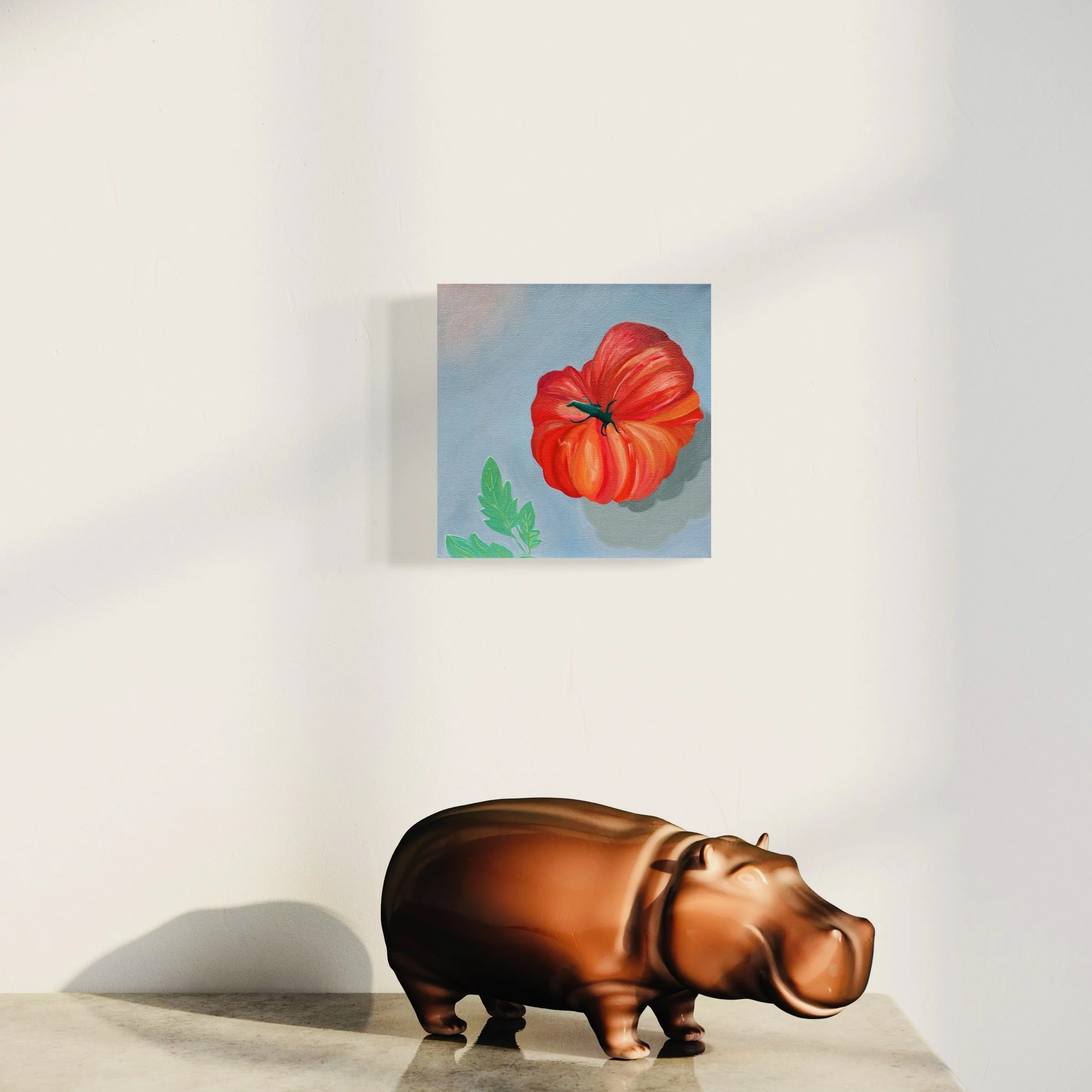Heirloom Heart. Oil on canvas. 8 x 8 inches. This richly toned still life honours the cherished legacy of heirloom tomatoes in Canada. Grown abundantly across backyards and small farms, this variety speaks to nourishment passed through generations. "Heirloom Heart" celebrates not just a fruit, but a symbol of flavour, resilience, and the beauty of slow cultivation in northern soil.