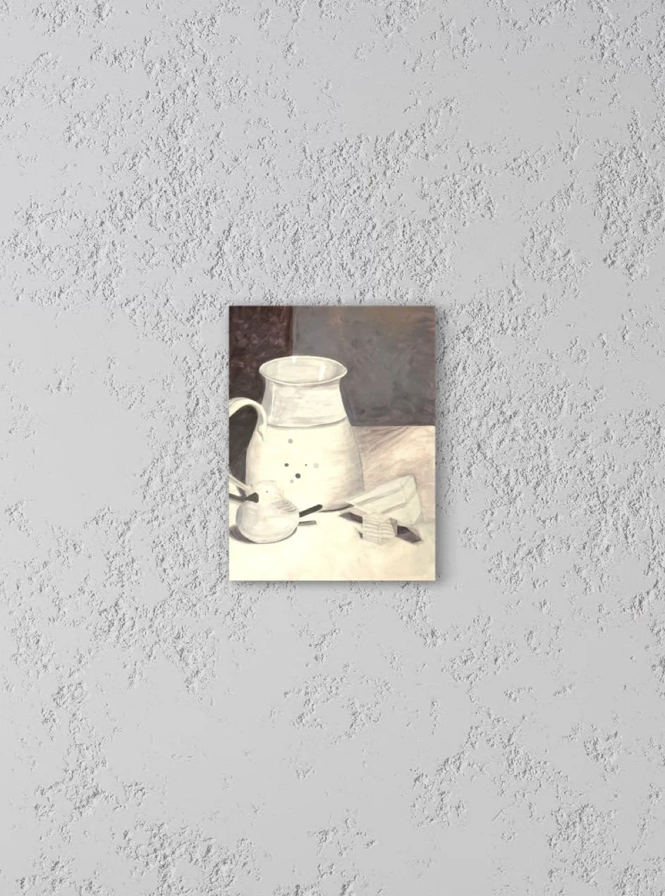 Ceramic and Wood. Acrylic on Bristol Paper, 24 x 18 inches. This quiet still life is a study in tonal harmony and material simplicity. A ceramic cup; wooden bird, triangle and cube indicate the beauty of restraint and the calm presence of familiar forms in a muted palette.