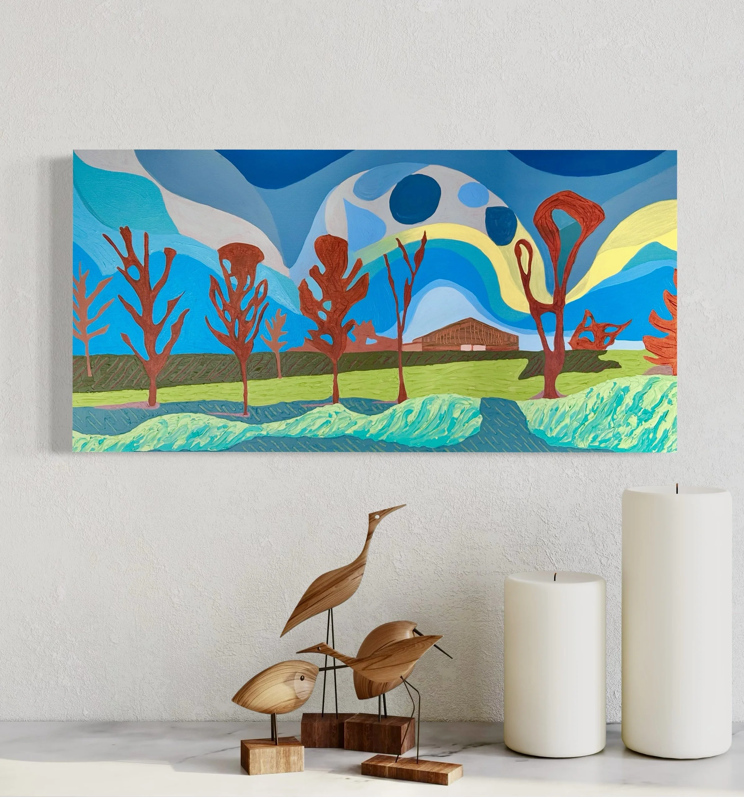The Vanishing Acreage. Acrylic on canvas. 15 x 30 inches. Inspired by the 100 Mile Diet movement, this painting reflects on the fragile balance between food sovereignty and land loss. The disappearing Canadian family farm stands at the edge of industrialization, memory, and resilience. Sweeping skies and rooted trees surround a barn barely holding its shape — a question, not an answer: Can we still feed ourselves locally?
