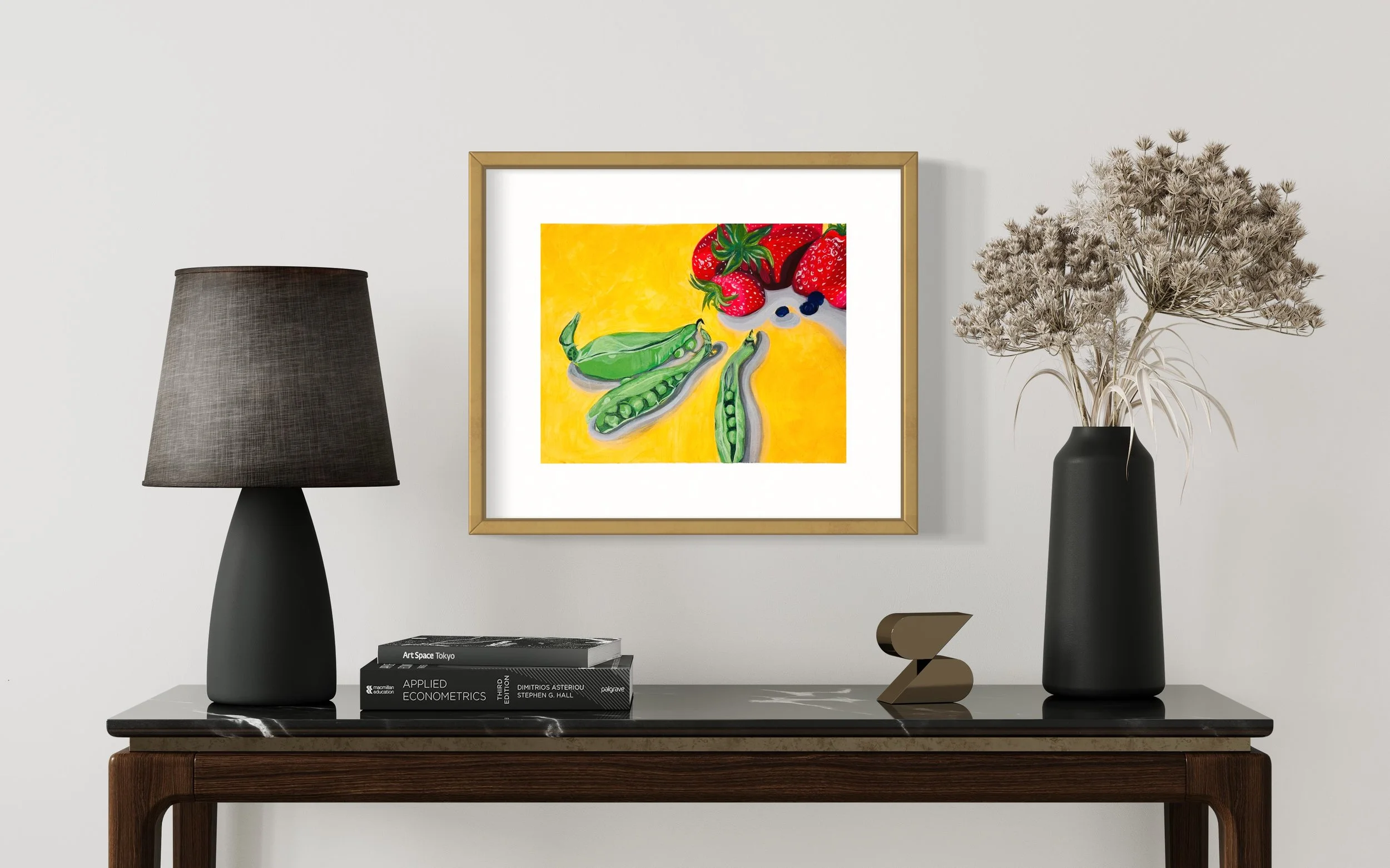 Keeping it Local. Acrylic on fine 135 lb (400 g) paper. 11 x 14 inches paper, framed & behind museum glass. This vibrant still life brings together strawberries, blueberries, and peas in pods — a tribute to seasonal abundance and the joys of eating close to home. It celebrates the quiet beauty of locally grown food, where each form holds colour, sweetness, and the spirit of summer in the Canadian landscape.